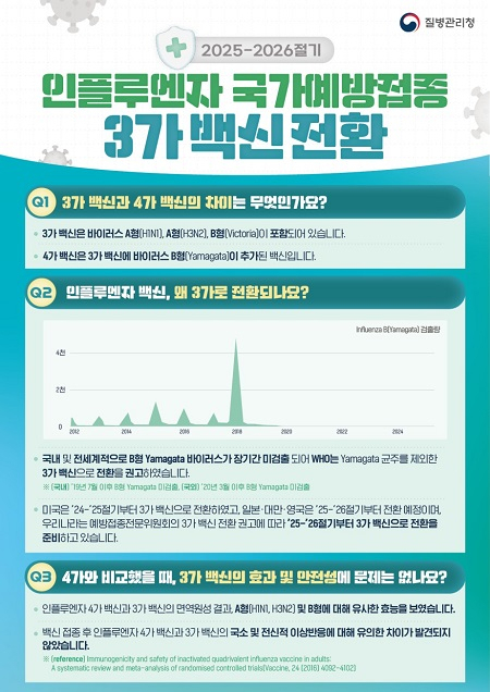 이번 인플루엔자 백신은 세계보건기구(WHO)의 권고사항과 예방접종전문위원회 심의에 따라 기존 4가 백신에서 3가 백신으로 전환된다.