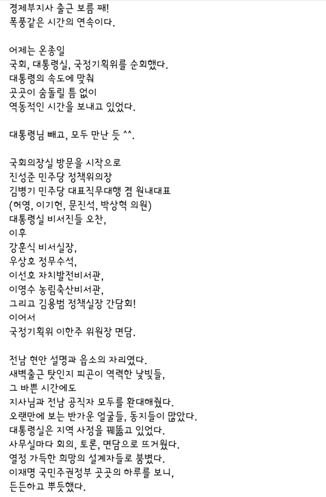 지난 7월2일에는 SNS에 "출근 보름째"라면서 "대통령님 빼고 모두 만난 듯^^…전남 현안 설명과 읍소의 자리였다"면서 활약상을 알렸다.