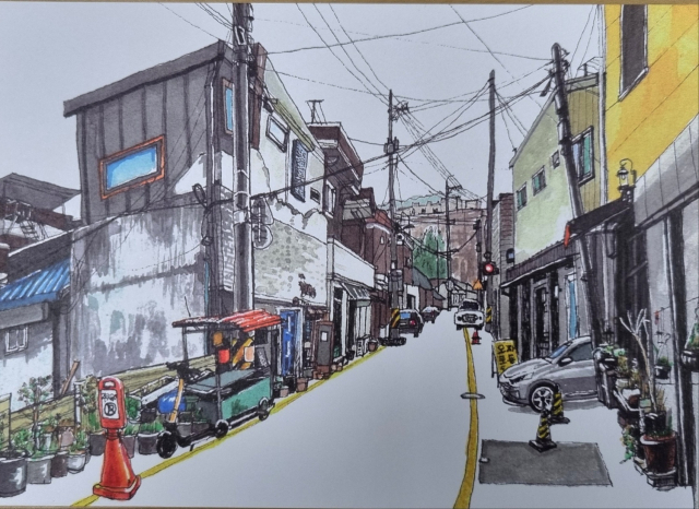 이번 전시회에 참여한 김재진 작가는 전주교육대학교로 향하는 길에서 마주한 골목 풍경을 작품에 담았다. 그는 “사라져가는 구도심 풍경이 아쉬워 그림으로 남겼다”며 “오래된 집과 새 건물, 담장 너머 꽃과 전선들이 어우러진 모습에서 우리의 일상을 발견할 수 있었다”고 말했다.