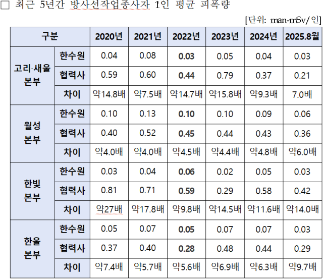 하청노동자 1인당 피폭량은 △한빛본부 0.58밀리시버트 △고리·세울본부 0.37밀리시버트 △한울본부 0.44밀리시버트 △월성본부 0.43밀리시버트였다. 네 본부의 정규직 피폭량은 0.04~0.09밀리시버트였다.