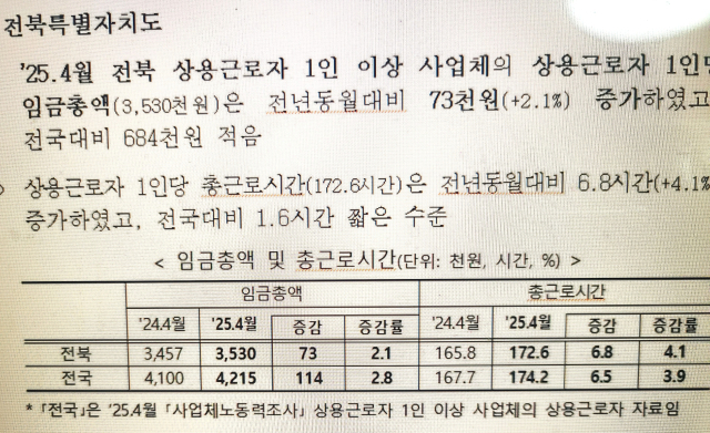 전북 상용근로자의 고달픈 현실은 고용노동부가 발표한 '2025년 4월 시·도별 임금·근로시간 조사 결과'에서 13일 밝혀졌다.