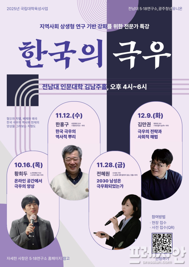 15일 전남대에 따르면 전남대 5·18연구소와 광주청년유니온이 공동 주최로 이달부터 오는 12월까지 총 4차례에 걸쳐 '한국의 극우'를 주제로 강연을 진행한다. 이번 강연 시리즈는 한국 극우의 역사와 현재 그리고 민주주의 회복을 위한 대응 방안을 심도 있게 모색하기 위해 기획됐다.