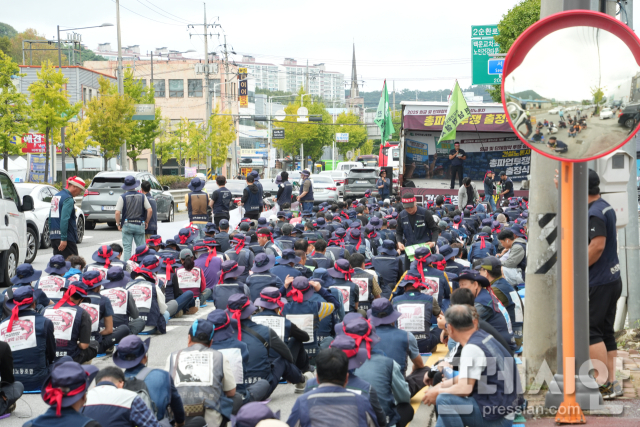 건설노조 광주전남·전북본부·제주본부 조합원 등 500여 명은 이날 오후 1시 광주 남구 송암공원 인근 아파트 건설 현장 앞에서 '호남권 건설노동자 총파업 투쟁 출정식'을 열었다. 참석자들은 5열로 앉아 "불법하도급·임금체불 퇴출, 중대재해 추방하자" 등 구호를 외치며 결의를 다졌다.