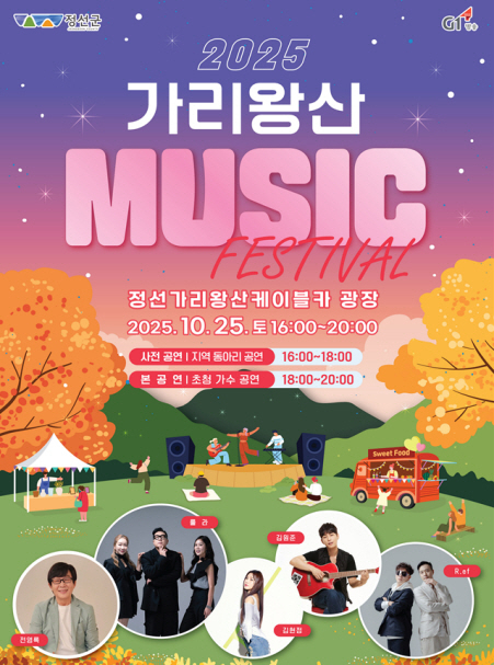 신원선 관광과장은 “가리왕산의 가을 풍경 아래에서 세대를 잇는 음악이 울려 퍼질 것”이라며 “정선을 찾는 모든 분들이 함께 즐기며 잊지 못할 가을 추억을 만들어가길 바란다”고 전했다.