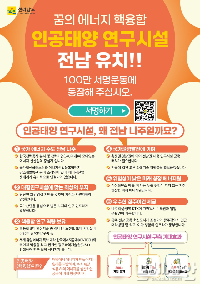 이번 서명운동은 인공태양 연구시설 유치에 대한 시민 공감대를 확산하고, 나주의 미래 성장 동력을 시민의 손으로 직접 만들어가자는 취지에서 마련됐다. 온라인과 오프라인을 병행해 추진되며, 시민 누구나 참여할 수 있도록 참여 창구를 폭넓게 열었다.