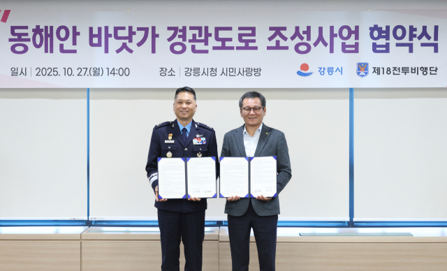 강원특별자치도 강릉시(시장 김홍규)는 27일 공군 제18전투비행단과 ‘동해안 바닷가 경관도로 조성사업’(남항진~안인 구간) 추진을 위한 업무협약(MOU)을 체결했다.