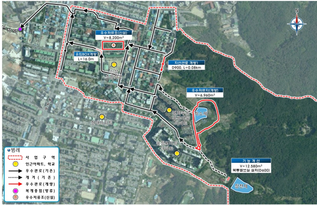 해당 지역은 지난 2020년 8월 8일 집중호우로 인해 2.0ha 규모 일대가 물에 잠긴 지역으로 시는 이번 사업을 통해 공원 지하에 초대형 우수저류조를 설치하고 학소제를 정비하는 등 도심형 홍수 대응시설을 단계적으로 갖춰 반복적인 침수 피해를 차단한다는 계획이다.