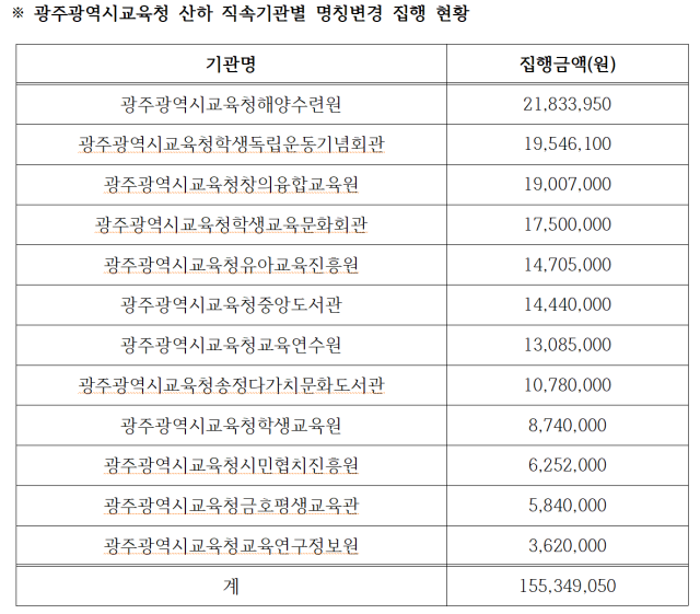 ▲광주광역시교육청 산하 직속기관별 명칭변경 집행 현황ⓒ학벌없는사회를 위한 시민모임