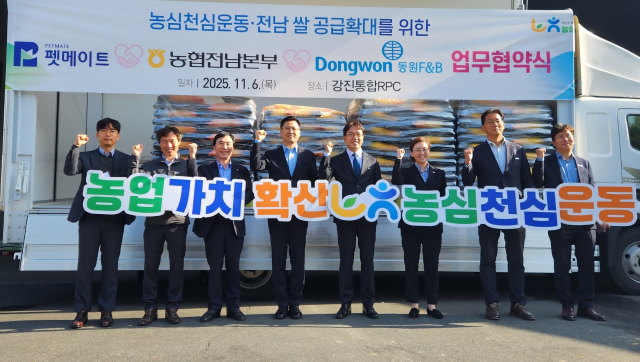 이번 협약은 전날 강진군농협쌀조합공동사업법인에서 이광일 본부장, 장인정 ㈜동원F&B 상무이사, 양우석 펫메이트(주) 대표이사, 진성국 강진농협 조합장(강진통합RPC 총회 조합장)을 비롯한 주요 관계자들이 참석한 가운데 진행됐다.