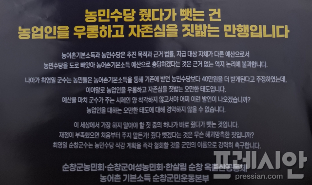 하지만 농민회는 “농민수당은 농업을 유지하는 농민에게 지급되는 보상 개념인데 이를 군민 전체 기본소득 재원으로 돌리는 것은 사실상 ‘줬다 빼앗기’”라며 “기본소득이 확대되더라도 농민수당은 그대로 줘야 하고 부족한 재원은 국비·도비를 확대해서 충당해야 한다”는 입장이다.