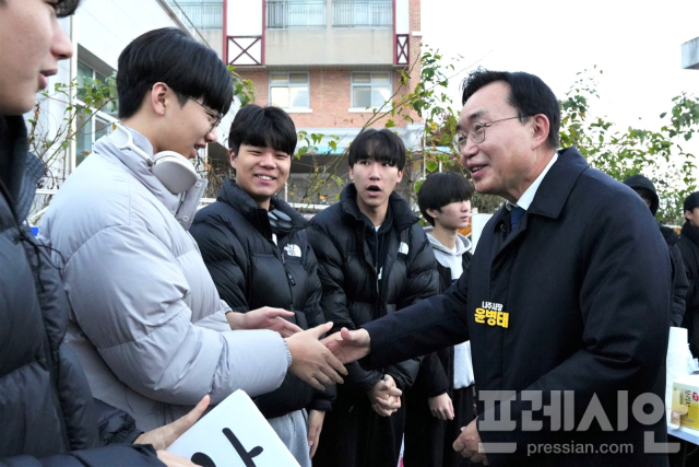 ▲윤병태 시장(오른쪽)이 수학능력시험을 치르는 선배들을 응원하기 위해 나온 학생들을 격려하고 있다.2025.11.13ⓒ나주시