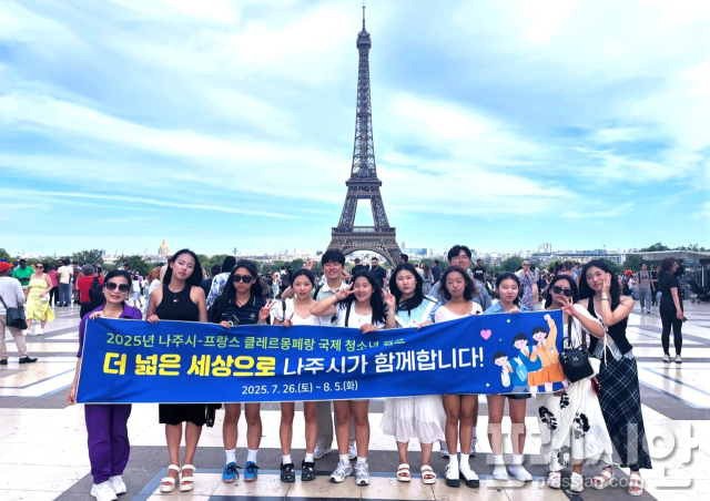 ▲지난 7월 26일부터 8월 5일까지 프랑스에서 열린 '프랑스 국제 청소년 여름캠프'에 참가한 나주 지역 고등학생들이 에펠탑 앞에서 기념 촬영을 하고 있다.ⓒ나주시
