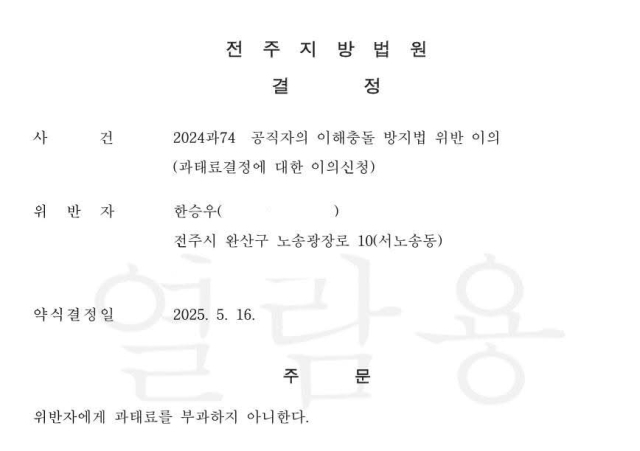 ▲과태료 처분 취소 결정문 ⓒ한승우 의원 SNS