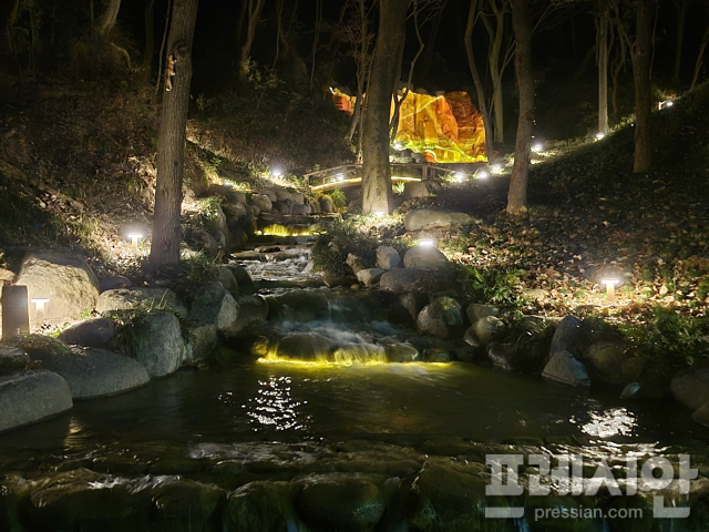 숲길 끝자락에는 은은한 조명과 물소리가 어우러진 야간 경관폭포가 자리한다. 폭포 아래로 흐르는 미디어파사드 조명은 잔잔하면서도 몰입감 있는 장면을 만들어내 방문객에게 깊은 안정감을 전달한다.