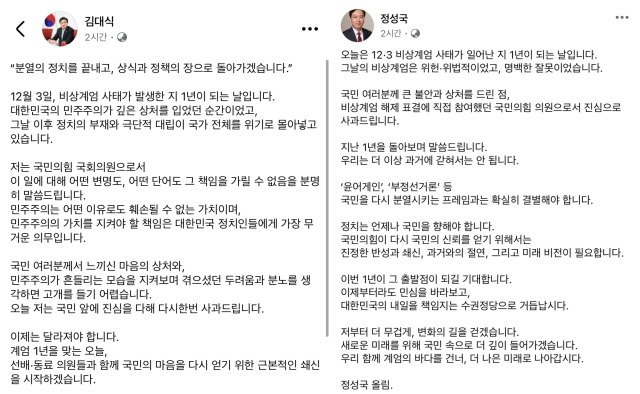 초선 의원들도 잇따라 사과 대열에 합류했다. 김대식 의원(부산 사상구)은 3일 오전 자신의 SNS에 "국민의힘 국회의원으로서 12·3 비상계엄에 대해 어떤 변명도 어떤 단어도 그 책임을 가릴 수 없음을 분명히 말씀드린다"며 "국민 앞에 진심을 다해 다시 한 번 사과드린다"고 했다.