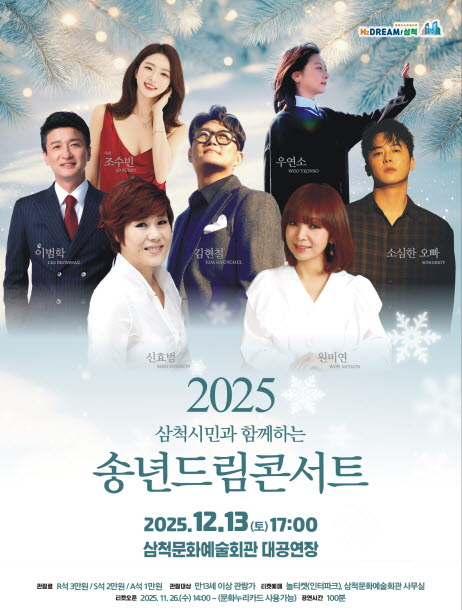 삼척시는 한 해를 마무리하는 시민들의 마음을 위로하고 희망의 새해를 함께 맞이하기 위해 연말 기획공연 ‘2025 삼척시민과 함께하는 송년드림콘서트’를 개최한다.