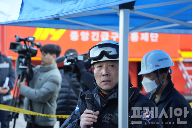 ▲12일 오전 안균재 서부소방서 안전예방과장이 광주대표도서관 붕괴 사고에 대한 브리핑을 진행하고 있다.2025.12.12ⓒ프레시안(김보현)