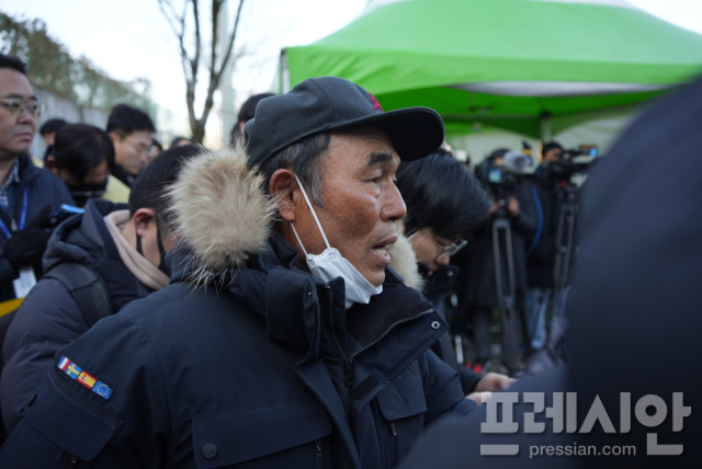 ▲12일 광주대표도서관 붕괴사고 현장 앞에서 열린 브리핑장에서 유족 고대성씨(68)가 업체 관계자에게 항의하며 질문하고 있다.2025.12.12ⓒ프레시안(김보현)