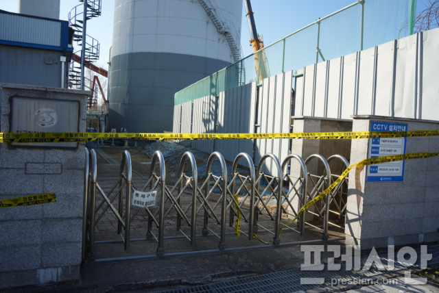 ▲12일 오전 광주 서구 광주대표도서관 공사 현장 인근에 쳐져 있는 폴리스라인과 출입통제 표시.2025.12.12ⓒ프레시안(김보현)