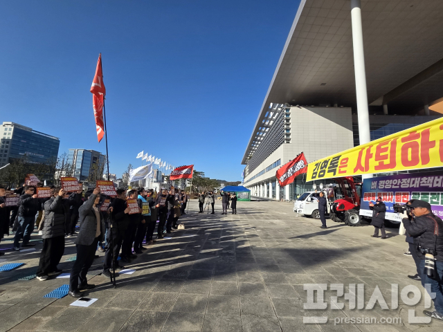▲9일 전남도의회 앞에서 전농 광전연맹, 쌀협회 전남본부, 전여농 광전연합 주최로 열린 '벼경영안정대책비 삭감 김영록 도지사 퇴진 광주전남 농민대회'에서 200여 명의 농민들이 트랙터를 몰고 결의대회를 진행하고 있다. 2025.12.09ⓒ프레시안(박아론)