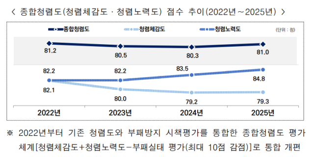 종합청렴도 평가는 ▲공공기관과 업무 경험이 있는 민원인(22만여명)과 기관 내부 공직자(8만여 명) 등 약 30만 명이 참여한 설문조사 결과인 ‘청렴체감도’ ▲기관이 1년간 추진한 부패방지 노력을 평가하는 ‘청렴노력도’ ▲부패사건 발생 현황을 감점으로 반영하는 ‘부패실태 평가’를 합산해 결과를 도출했다.