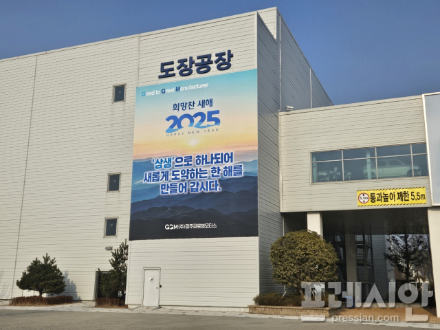 ▲광주글로벌모터스(GGM) 도장공장 벽면에 '상생으로 하나되어 새롭게 도약하는 한 해를 만들어갑시다'라는 덕담이 적힌 현수막이 게첨돼 있다.2025.01.14ⓒ프레시안(김보현)