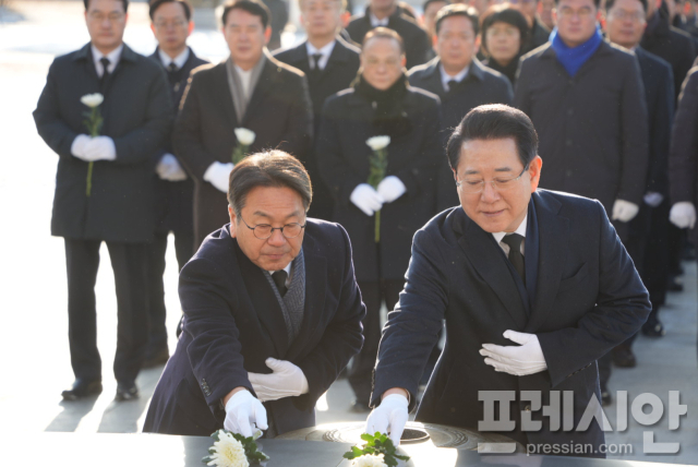 강기정 광주광역시장과 김영록 전라남도지사는 2026년 새해 첫 업무일인 2일 국립 5·18민주묘지에서 만나 '광주·전남 대통합 추진 공동선언문'을 발표했다.