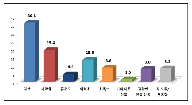 이외 기타 다른인물 1.5%, 적합한 인물 없음 8.0%, 잘모름·무응답 8.3%였다.