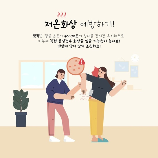 또한 잠을 자는 동안에는 온도를 느끼지 못해 화상 위험이 극대화되므로 핫팩 사용을 삼가야 하고,사용 전 제품이 터지거나 내용물이 새어 나오지 않는지 손상 여부를 확인해야 한다고 조언한다.