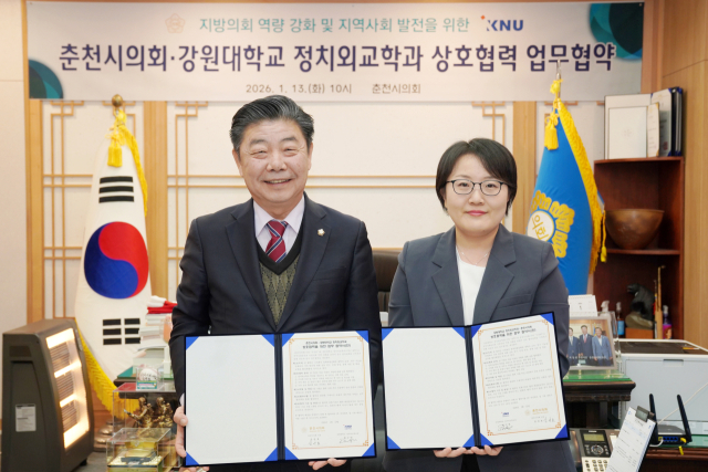 강원대학교(총장 정재연) 사회과학대학 정치외교학과(학과장 정구연)는 13일 춘천시의회(의장 김진호)와 ‘지방의회 역량 강화 및 지역사회 발전을 위한 업무협약’을 체결했다.