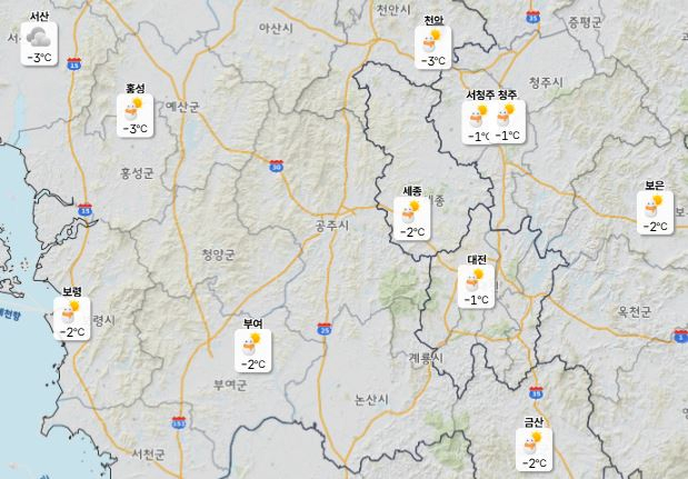 이날 낮 최고기온은 대전 1도, 세종·청주 2도, 천안 0도로 예보됐으며 아침 최저기온은 -3도에 머물 전망이다.