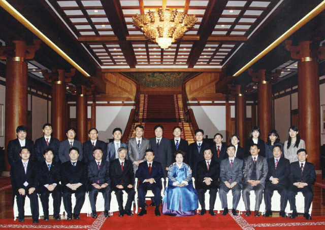 ▲노무현 전 대통령의 퇴임 이틀 전에 청와대에 근부했던 동료들과 함께 본관 로비에서 대통령 내외분과 기념촬영을 하고 있다.ⓒ