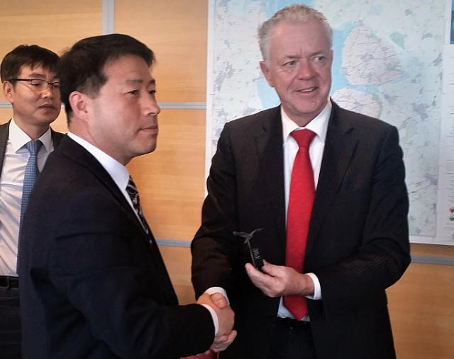▲새만금사업을 벤치마킹하기 위해 네덜란드 주다치시를 방문한 황태규 교수가 폴레볼란트 주지사와 악수를 하고 있다.ⓒ
