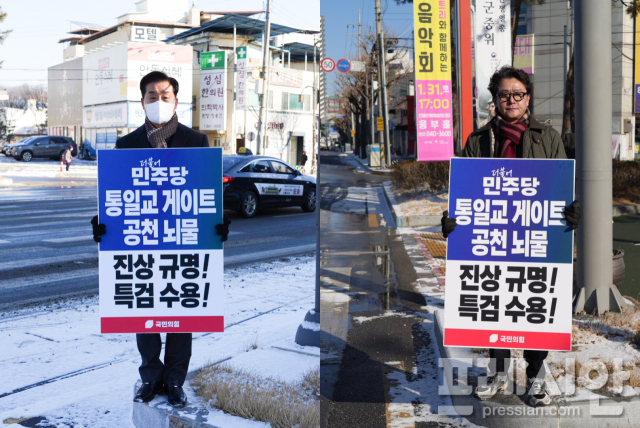 밤사이 눈이 내린 안동은 찬 바람과 함께 체감온도 영하 10도를 오가는 날씨이도 불구하고, 이날 피켓시위에는 김형동 의원과 함께 권기윤(옥동). 김창현(강남.임하. 남선) 의원은 물론 시당직자들도 함께 지원에 참여했다.