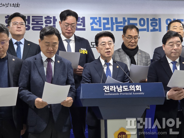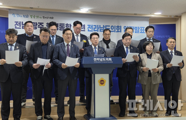 김태균 전남도의장 등 13명의 도의원들은 2일 오전 전남도의회에서 '전남광주 행정통합 관련 전남도의회 입장발표' 기자회견을 열었다.