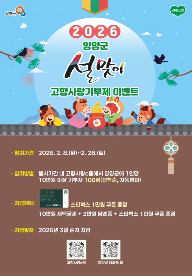 강원특별자치도 양양군이 2026년 설 명절을 맞아 고향사랑기부제 참여 확산을 위해 '붉은 말의 해! 고향사랑기부제 설맞이 이벤트'를 실시한다.