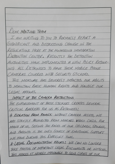 글을 쓴 구금 이주민 벤자민 씨는 난민 신청을 준비 중이었다. 휴대전화 사용 시간은 1주일에 1시간씩 총 2번으로 제한됐는데, 이제 카메라 촬영 마저 막히니 변호사에게 보내야 할 서류를 제때 찍어 보낼 수조차 없어 애를 먹고 있었다.