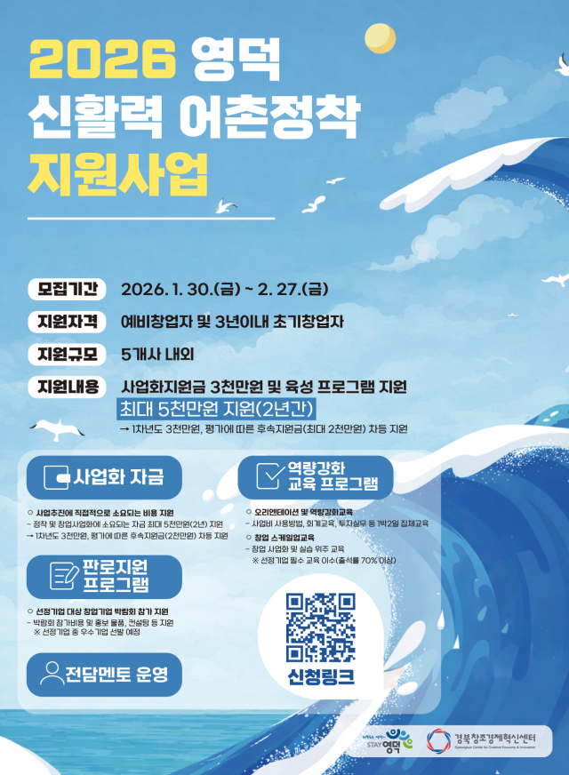 영덕군은 지역자원을 활용한 창업자를 발굴하고 육성하기 위해 ‘신활력 어촌정착 지원사업’에 참여할 창업자를 이달 27일까지