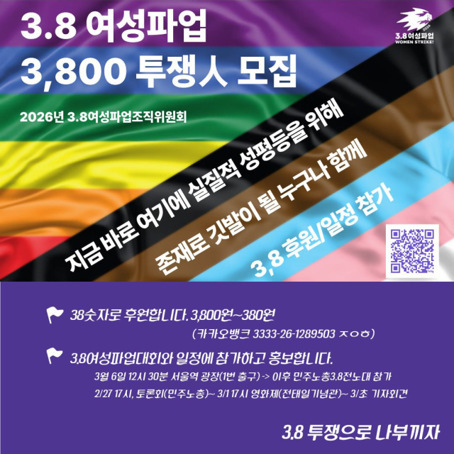 3월 8일은 국제여성의 날입니다. 2026년 정권이 교체되었지만, 여전히 여성·성소수자 등 많은 소수자들은 열악한 임금과 노동조건, 고용불안에 시달리고 있습니다. 1975년 아이슬란드에서 처음 시작된 여성파업은 여성노동자의 권리를 앞당기고 성평등을 진전시켰습니다. 한국에서도 '지금 여기에 실질적 성평등!'을 요구하며 국제여성의 날을 앞둔 3월 6일에 3·8여성파업대회를 합니다. 3·8여성파업대회에 함께 하는 단위들이 3·8여성파업의 의미를 나누고자 연재합니다. 편집자.