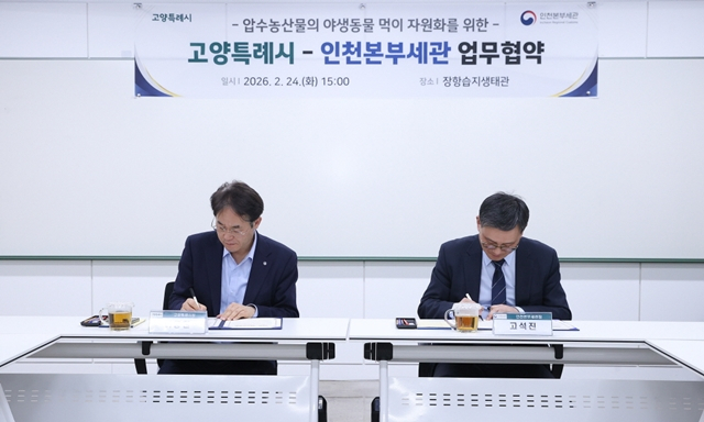 고양특례시와 인천본부세관이 장항습지에 서식하는 야생동물의 생태환경 지원을 위한 업무협약을 24일 체결했다.