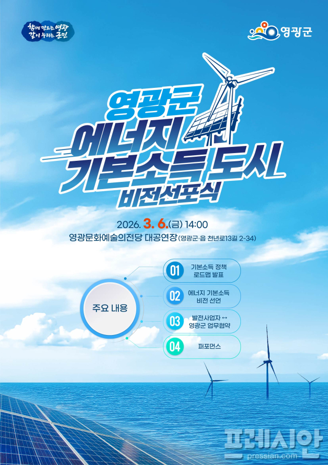 영광군은 내달 6일 영광문화예술의전당 대공연장에서 '영광군 에너지 기본소득 도시 비전선포식'을 개최한다고 25일 밝혔다.