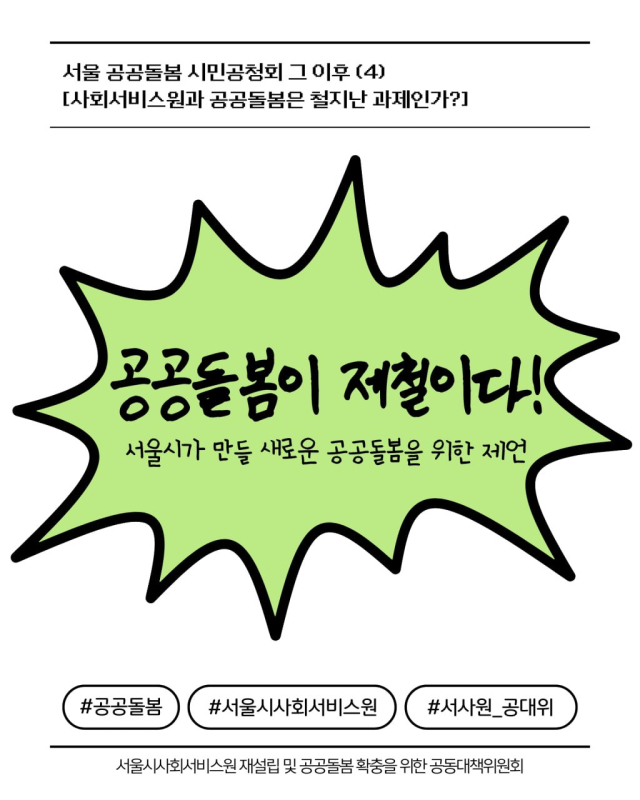 지난해 10월 시민 5000여 명의 청원으로 서울시 공공돌봄 시민공청회가 열렸다. 2024년 5월 서울시 산하 돌봄서비스 기관인 서울시사회서비스원이 해산된 후, 서울시 공공돌봄 정책이 후퇴한다는 우려가 나오던 때였다. 이후 서울시는 공청회에서 제기된 지적에 대해 답변서를 냈다. 서울시사회서비스원 재설립 및 공공돌봄 확충을 위한 공동대책위원회가 답변을 공론화하고, 이에 반박하는 기고를 보내왔다. 네 차례에 걸쳐 싣는다.