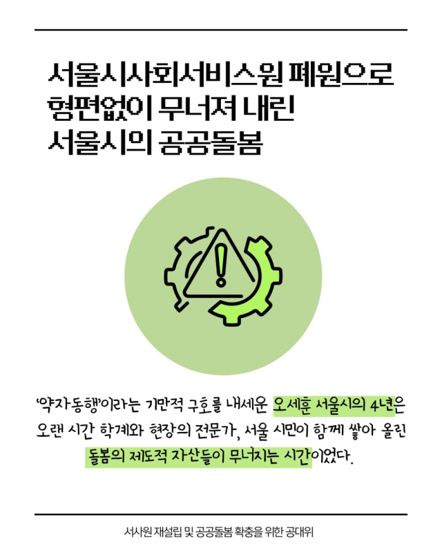 한국 사회의 돌봄 관련 정책이 걸어온 길은 험난했고, 지금도 녹록지 않은 상황이다. 특히 최근 서울시의 돌봄은 근래에 보기 어려운 수준의 퇴행을 경험했다. 오랜 시간에 걸쳐 노동과 시민사회, 그리고 학계와 현장의 전문가들과 함께 서울 시민이 쌓아 올린 서울시 돌봄의 제도적 자산들은 내란 정당이 주도하는 서울시정과 서울시 의회 권력이 지속되는 동안 형편없이 무너져 내렸다. 군사 작전마냥 전격적으로 이루어진 서울시 사회서비스원의 폐원은 서울시가 시민의 돌봄권과 노동인권에 얼마나 심각한 해악을 미칠 수 있는지 그 끝을 보여준 사건이라 할 수 있다.