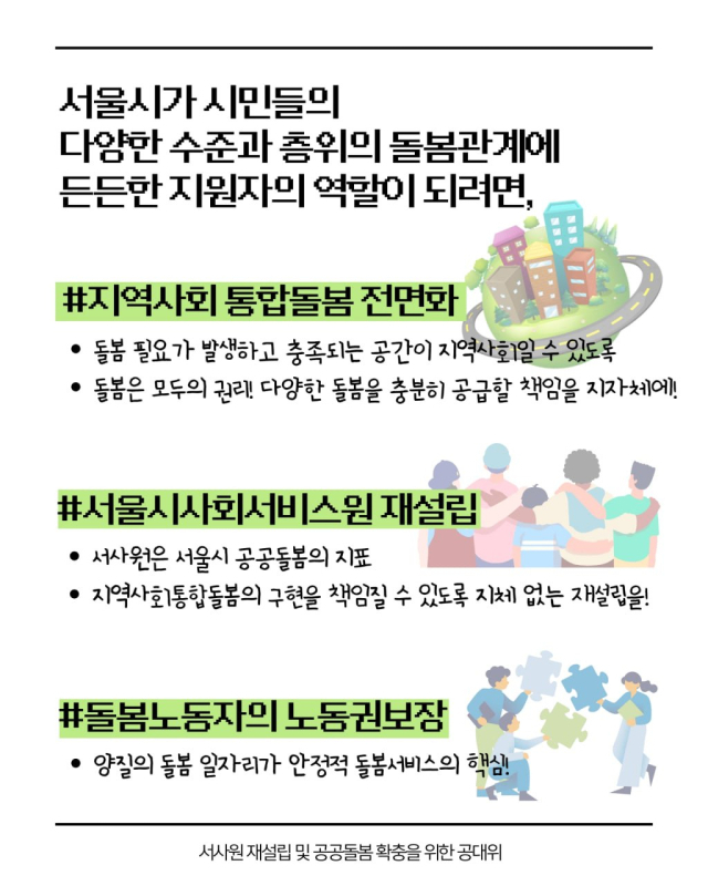 특히 서울시에 거주하는 사람들 모두의 권리로서의 돌봄을 보장하기 위한 다양한 돌봄의 충분한 공급에 있어 시와 구가 주요한 책임과 주도권을 행사하는 것은 필수적인 과제이며, 지금의 조건에서 공공돌봄 제공의 과제는 사회서비스원을 통해 실현되는 것이 가장 바람직하다.