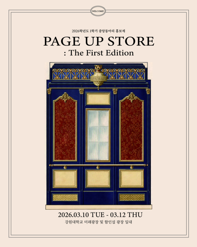 강원대학교(총장 정재연) 춘천캠퍼스(캠퍼스총장 임의영) 제40대 ‘Page’ 총동아리연합회는 10~12일까지 춘천캠퍼스 함인섭광장과 미래광장 일대에서 ‘2026학년도 1학기 중앙동아리 홍보제 ‘PAGE UP STORE : The First Edition’’을 개최한다.