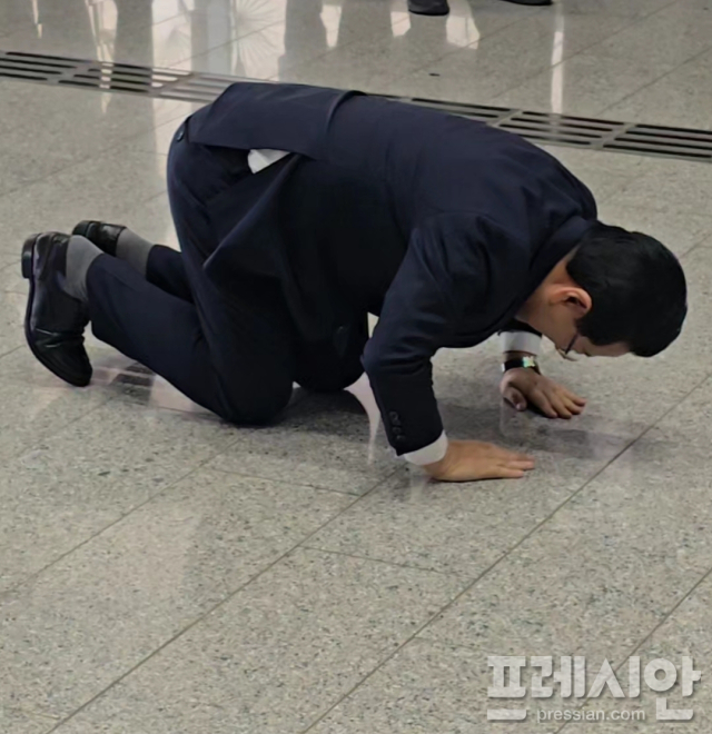 ▲예비후보 등록 전 도청사를 떠나며 큰절하는 김영록 지사2026.3.9ⓒ프레시안(박아론)