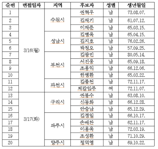 ▲더불어민주당 경기도당 16‧17일 면접 후보자 명단.ⓒ더불어민주당 경기도당