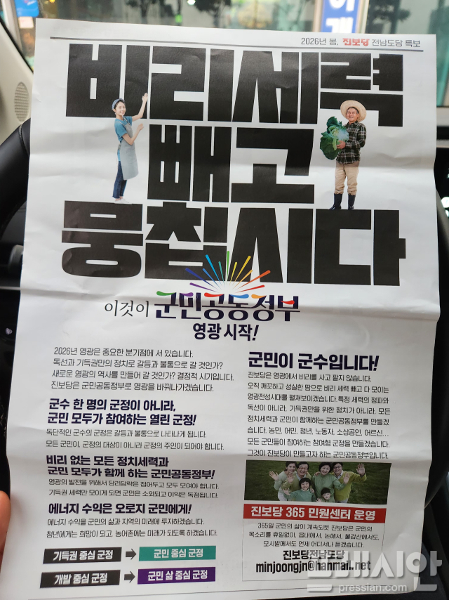 진보당 명의의 이번 전단지에서는 "계속되는 본인 친척 비리의혹, 고소·고발 남발과 불통 행정, 업자들이 판치고 군민들이 배제되고 갈라치기 군정과 군민 갈등 심화, 그냥 두시겠습니까" 등의 내용이 담겨 있다.