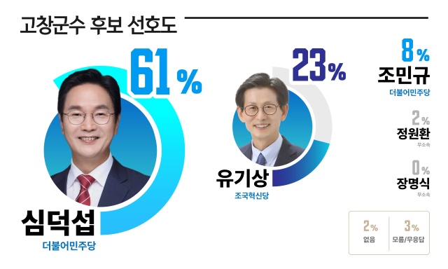 전주MBC·전북도민일보·<프레시안>전북취재본부가 3월 27일부터 29일까지 여론조사 전문기관인 코리아리서치인터내셔널에 공동의뢰해 실시한 여론조사 결과, 차기 고창군수 후보 선호도 조사에서 심덕섭 현 군수가 61%로 가장 높게 나타났으며, 그 다음이 유기상 전 민선7기 고창군수 23%, 조민규 현 고창군의회 의장 8%로 뒤를 이었다.