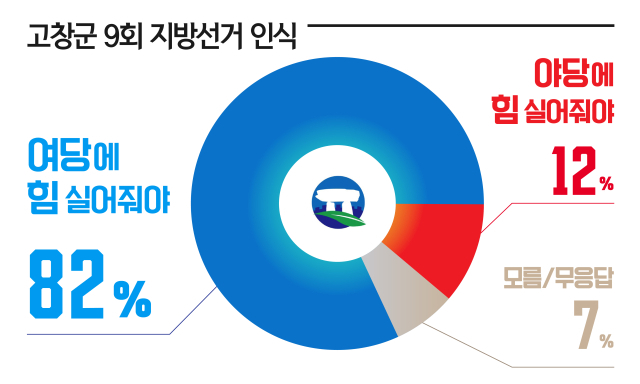 고창 군민들의 82%는 이번 6.3지방선거를 통해 '현 정부의 국정안정을 위해 여당에 힘을 실어줘야 한다"고 생각하는 것으로 나타났다. 반면에 '현 정부를 견제하기 위해 야당에 힘을 실어 줘야 한다'는 응답은 12%에 불과했다.